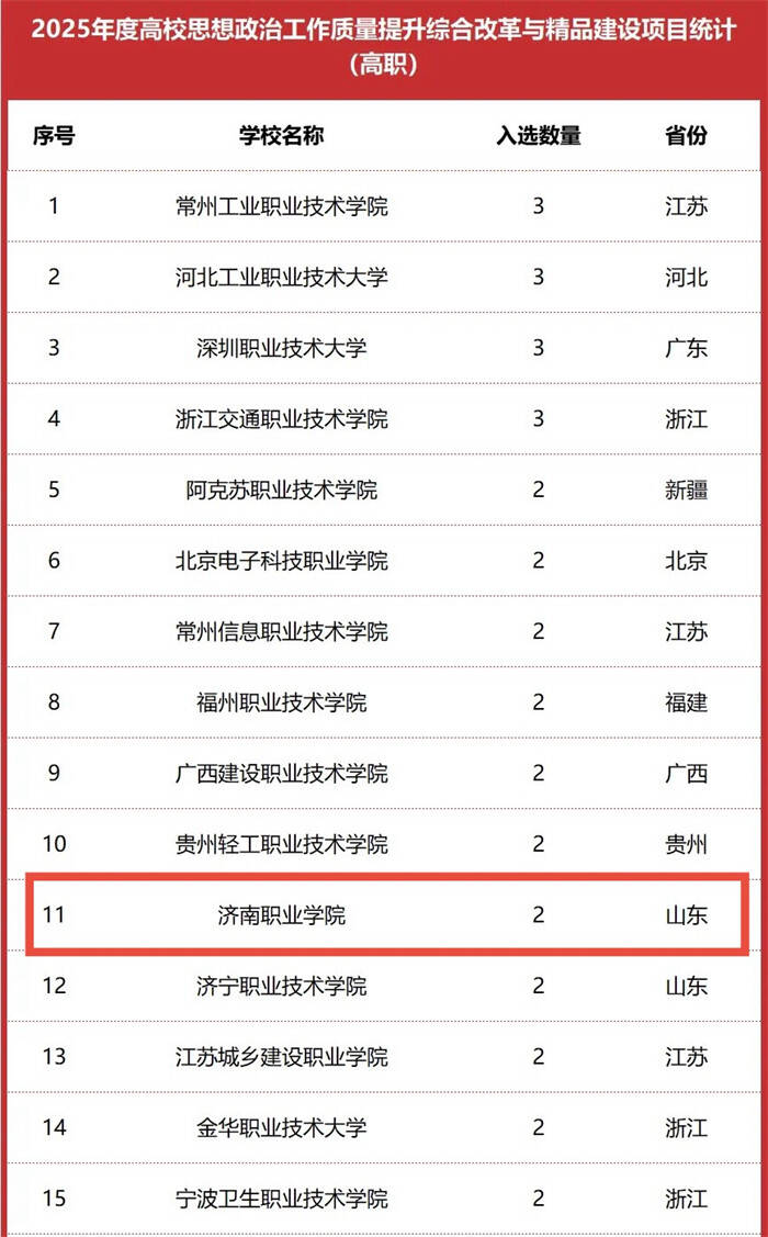 济南职业学院2项事例当选教育部2025年度高校思维政治作业质量提高归纳变革与精品建造项目